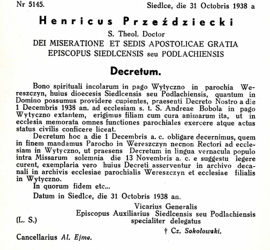 Ks. Telesfor Perechuda był rektorem filii duszpasterskiej w Wytycznie do 19 października 1942 r.